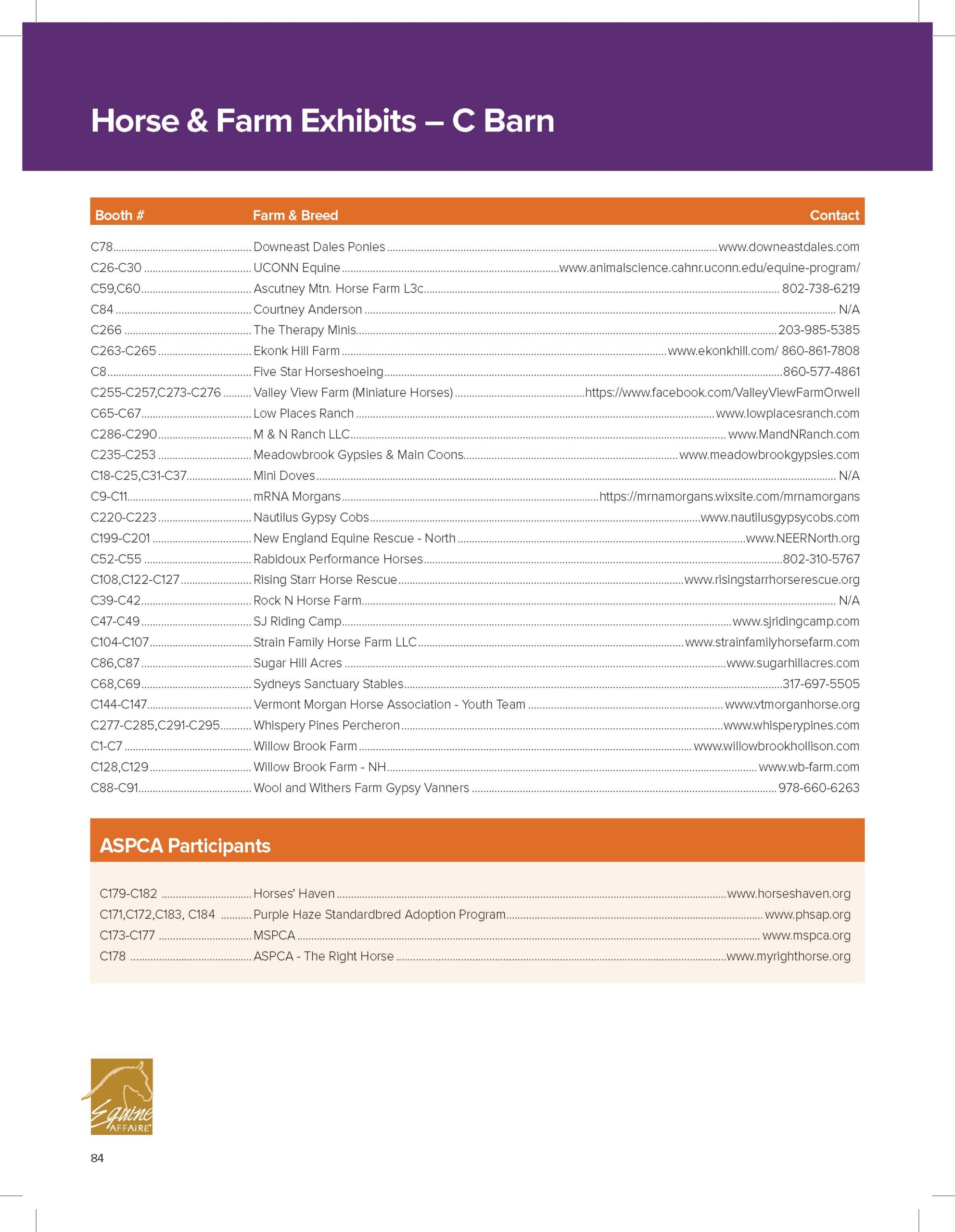 Equine Affaire’s popular Horse & Farm Exhibits area is where horse owners, horse farm owners, and horse service providers connect with customers who are interested in all breeds of horses and a variety of equestrian disciplines. Located in C-Barn at the Eastern States Exposition, the Horse & Farm Exhibits is an area dedicated to the promotion of horse farms, training facilities, lesson facilities, breeding stallions, and horses for sale. Horse & Farm exhibitors and “For Sale” stalls will be organized in the barn by breed/type of horse, and a map of C-Barn and the Horse & Farm Exhibits will be included in your free event program.